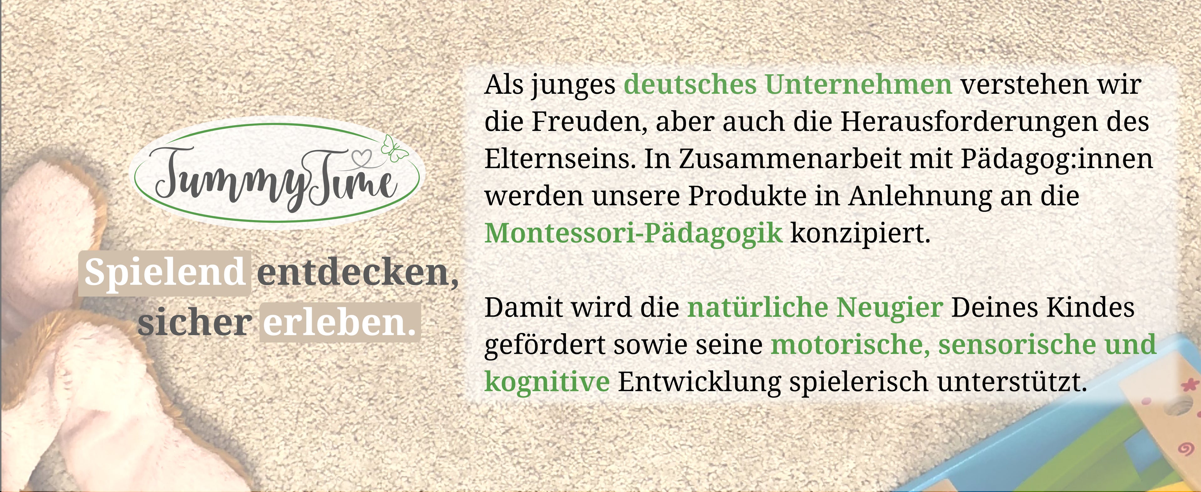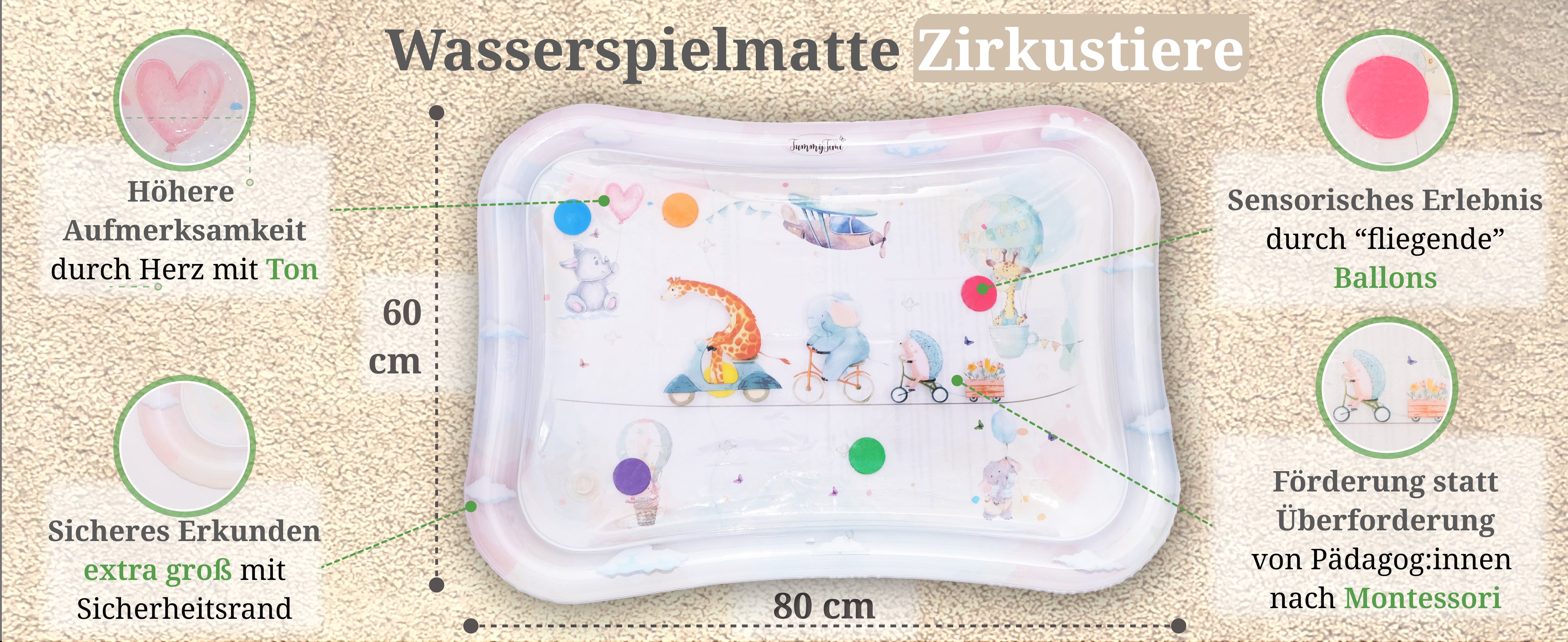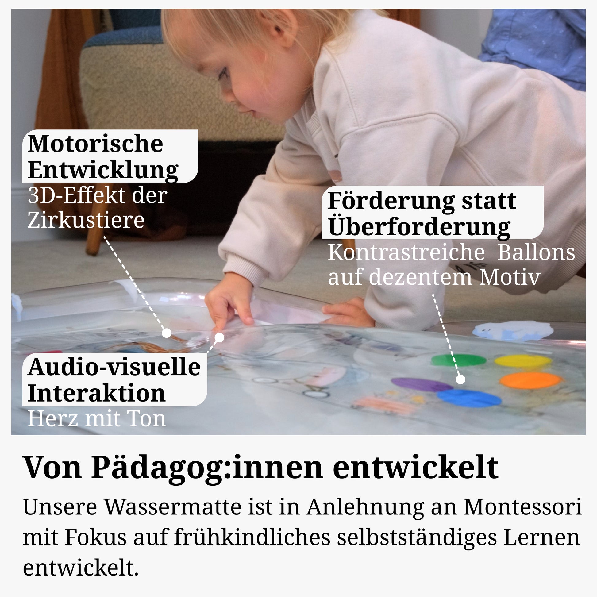 Our "Circus Animals" water play mat was designed according to Montessori principles in collaboration with German educators. The colors and motifs are chosen to encourage your baby to lie on its stomach without overwhelming them. The sensory toy supports this in many ways, for example with the integrated squeaking element for initial contact.