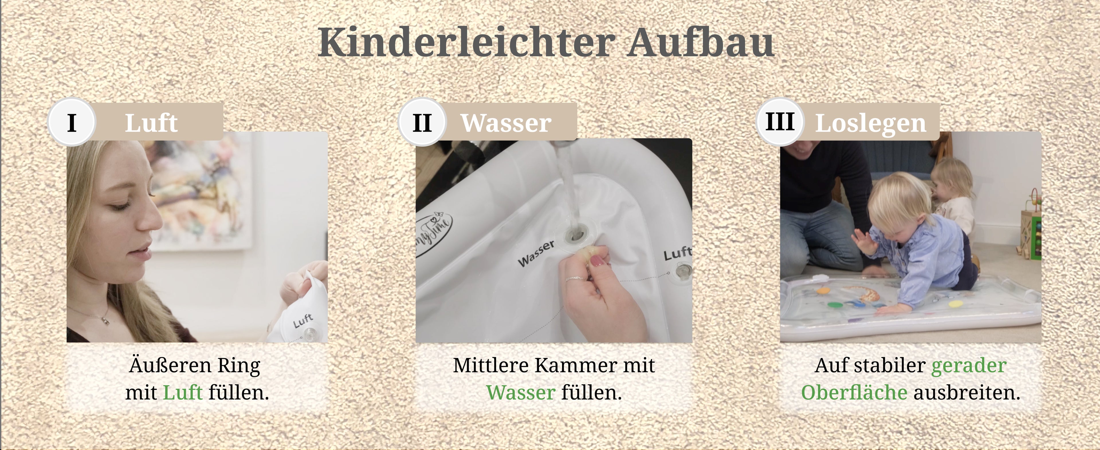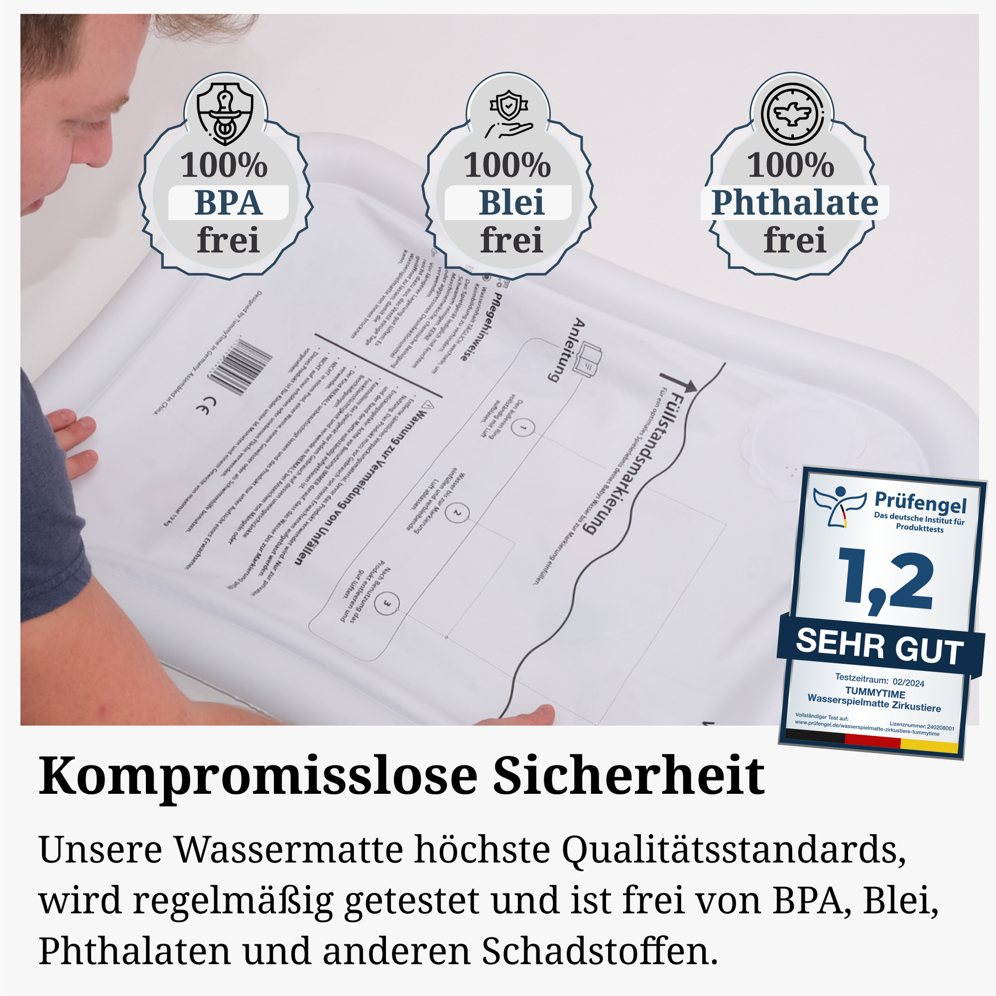 We only use certified, high-quality materials that are 100% free of BPA, lead or phthalates. The durable material ensures that the water play mat can withstand active babies at all times. Each crawling mat is also tested separately for leaks and quality.